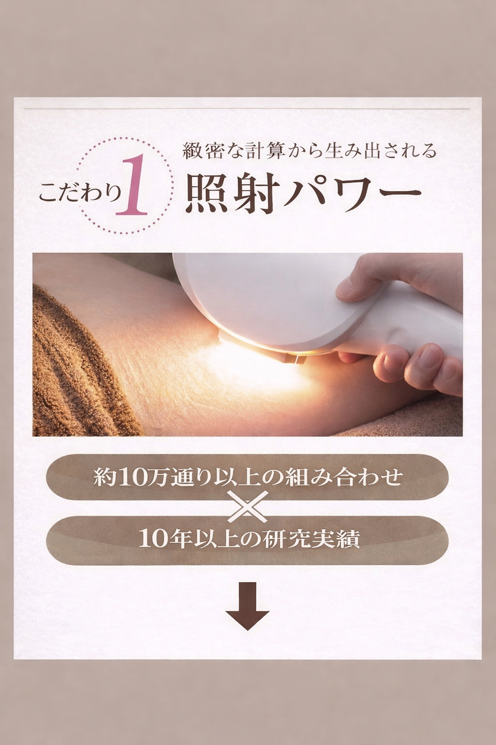 脱毛力は「熱量(J数)」と、「波長」「パルス数」✕「バルス幅」✕「照射面の材質」の組み合わせによって決まります。脱毛器は約10万通り以上の組み合わせを実験し、脱毛力が一番高かった脱毛方式を採用。「